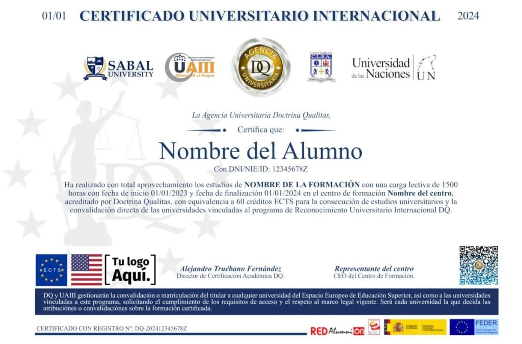 El Certificado Universitario Internacional DQ es un documento complementario que valida tu formación académica a nivel internacional. Este certificado, desarrollado por Doctrina Qualitas, amplifica las oportunidades de reconocimiento de tus estudios y te abre puertas en el ámbito académico, profesional y de movilidad internacional.